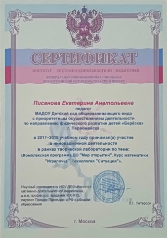 Участник в инновационной деятельности в рамках творческой лаборатории по теме: "Комплексная программа ДО "Мир открытий". Курс математики "Игралочка". Технология "Ситуция". 2017 - 2018 г.