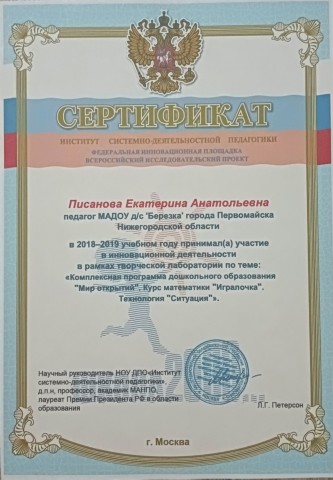 Участник в инновационной деятельности в рамках творческой лаборатории по теме: "Комплексная программа дошкольного образования "Мир открытий". Курс математики "Игралочка". Технология "Ситуция". 2018 - 2019 г.