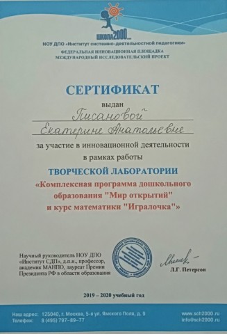 Участник в инновационной деятельности в рамках работы творческой лаборатории по теме: "Комплексная программа дошкольного образования "Мир открытий".и курс математики "Игралочка". 2019 - 2020 г.